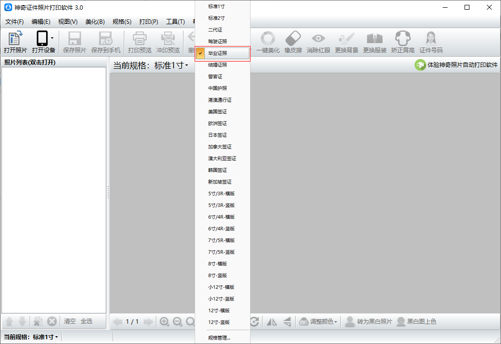 2、点击之后出现下拉菜单,可以看到有各种规格,这里我们选择毕业证照,您可以根据您的具体需求选择相应的规格。