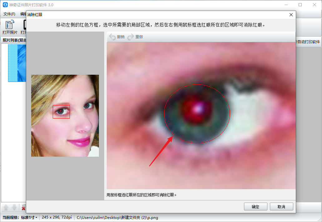 3、移动左侧红色框到眼睛部位,在右侧用鼠标在红眼的范围画出一个圆形,如下图所示。