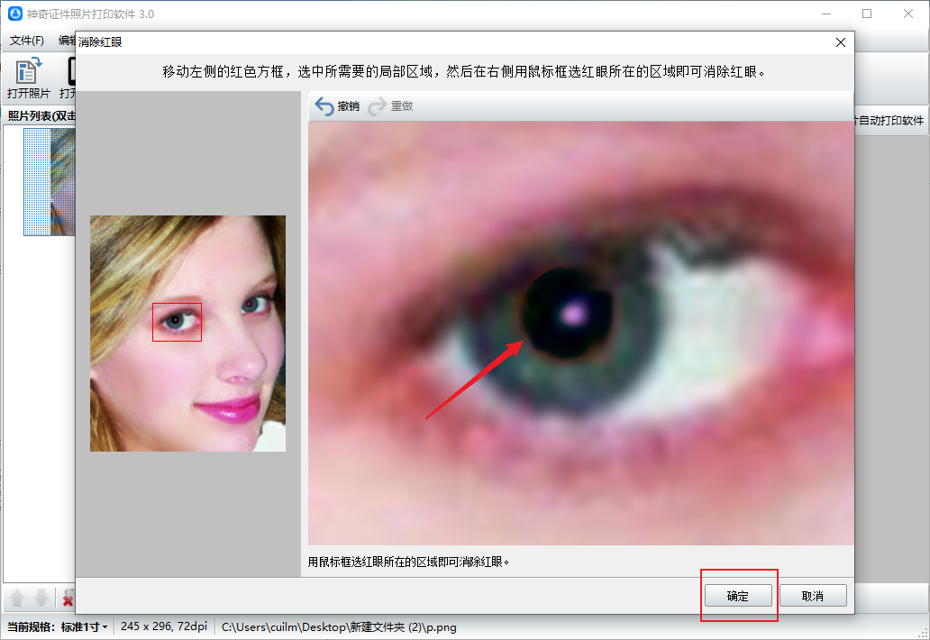 4、松开鼠标,会发现红眼消失了,真的是一键去除红眼,点击确定按钮。