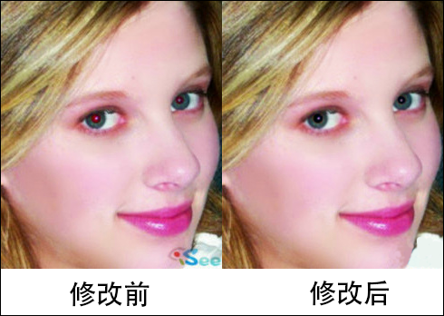 5、使用同样的方法把另外一只眼睛修改完成,下图是修改前后的对比,可以很直观的看到使用我们的软件可以很好的消除红眼。
