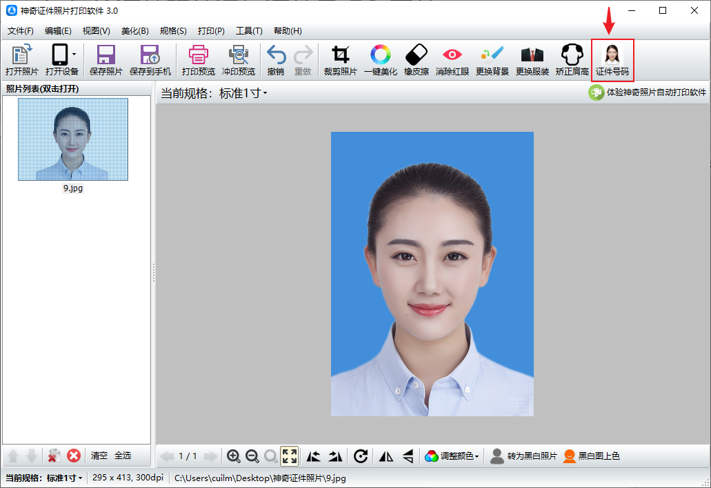 1、在软件里打开一张照片,点击软件上方的证件号码按钮。