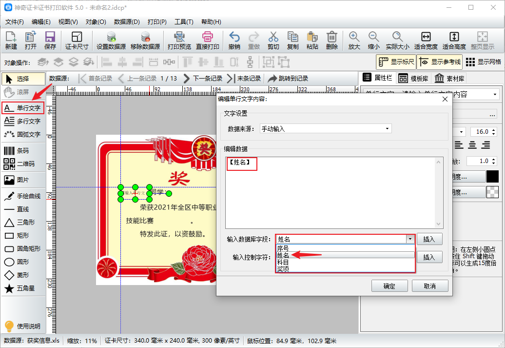 四、点击单行文字按钮,弹出一个界面,在输入数据库字段里选择姓名,点击插入。