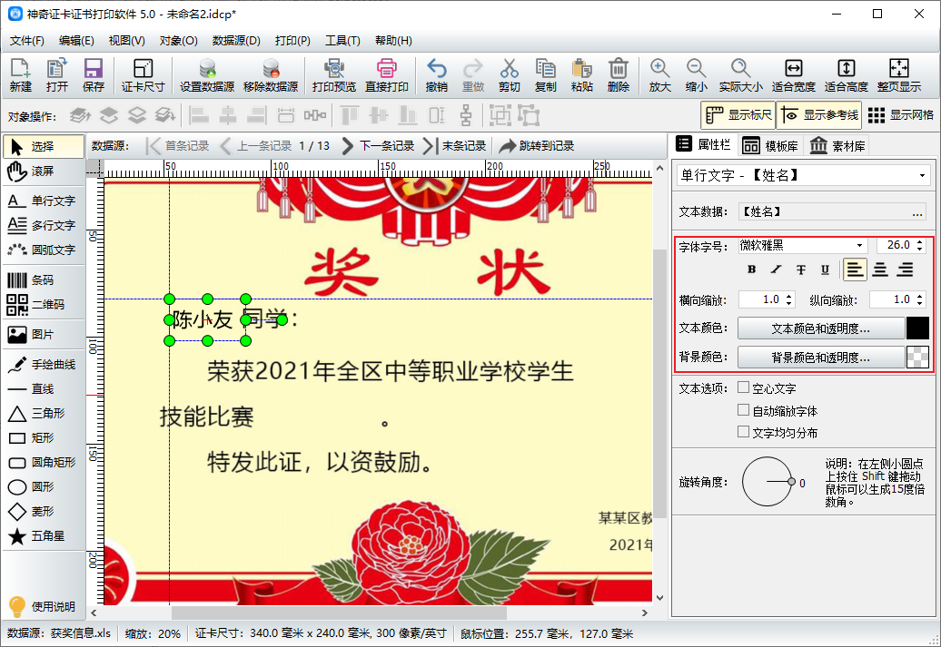 奖状我们都不陌生,学校或者单位都会在年度末为优秀的学生或员工发奖状。这些文件的主体结构大致相同,部分内容比如姓名,奖项名称等不同。如何批量制作呢,小编带着大家一起用神奇证卡证书打印软件做一个奖状。