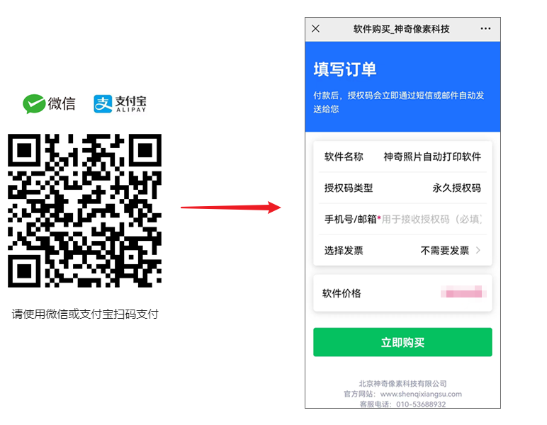 购买方式一:使用手机微信或支付宝APP扫描下图的二维码,扫描后手机会出现购买界面,请填写手机号或邮箱,用于接收授权码,如需发票请在发票处选择发票类型。