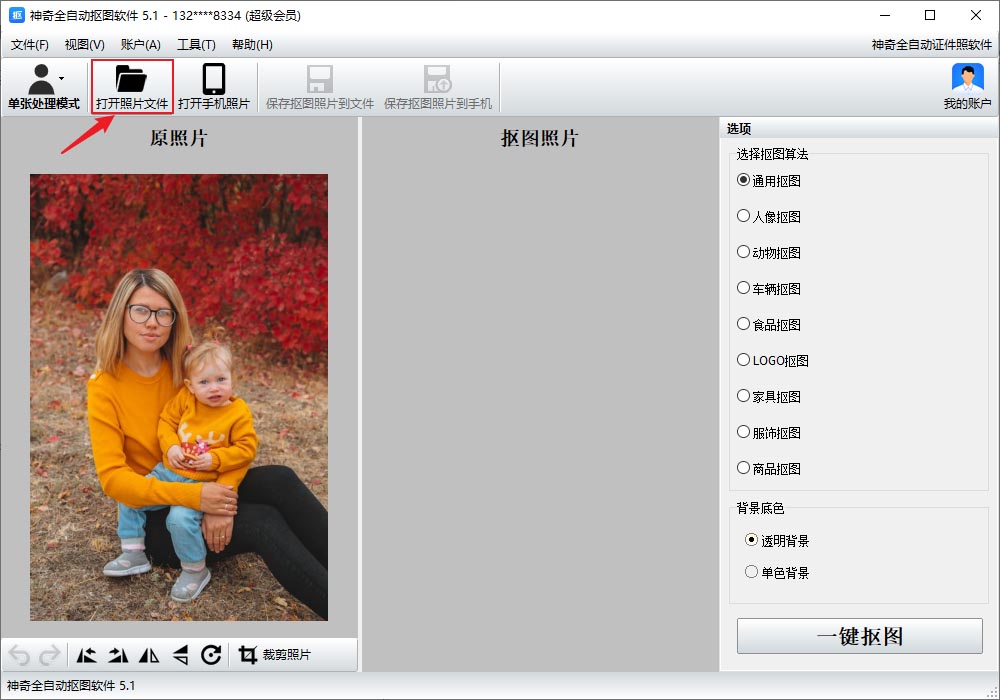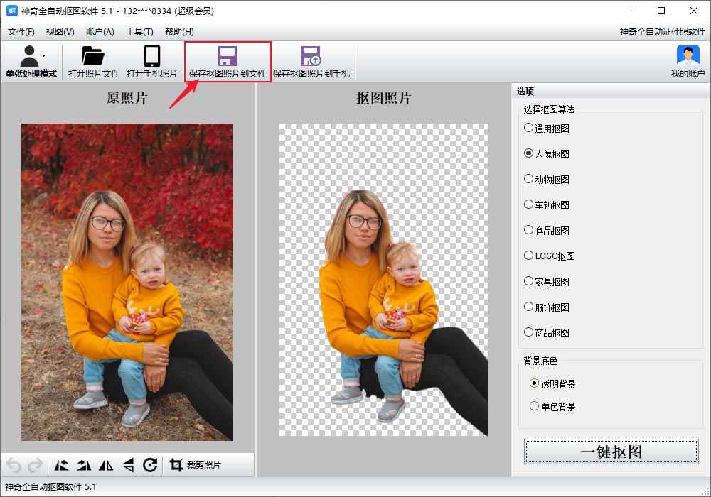 3、在选项中选择人像抠图,背景底色可以根据需要选择,然后点击一键抠图。