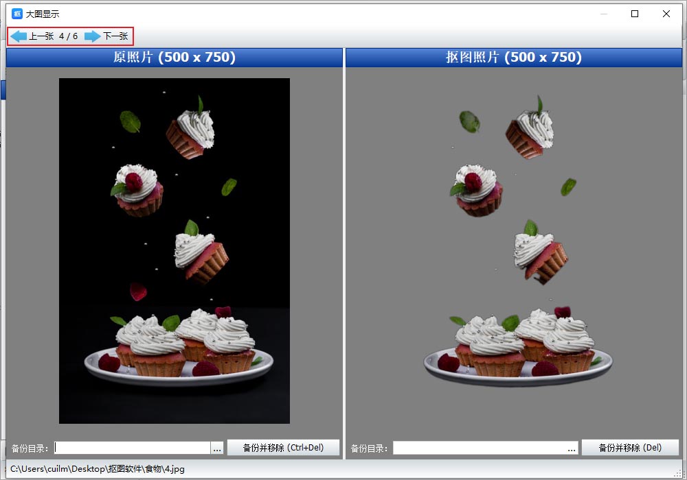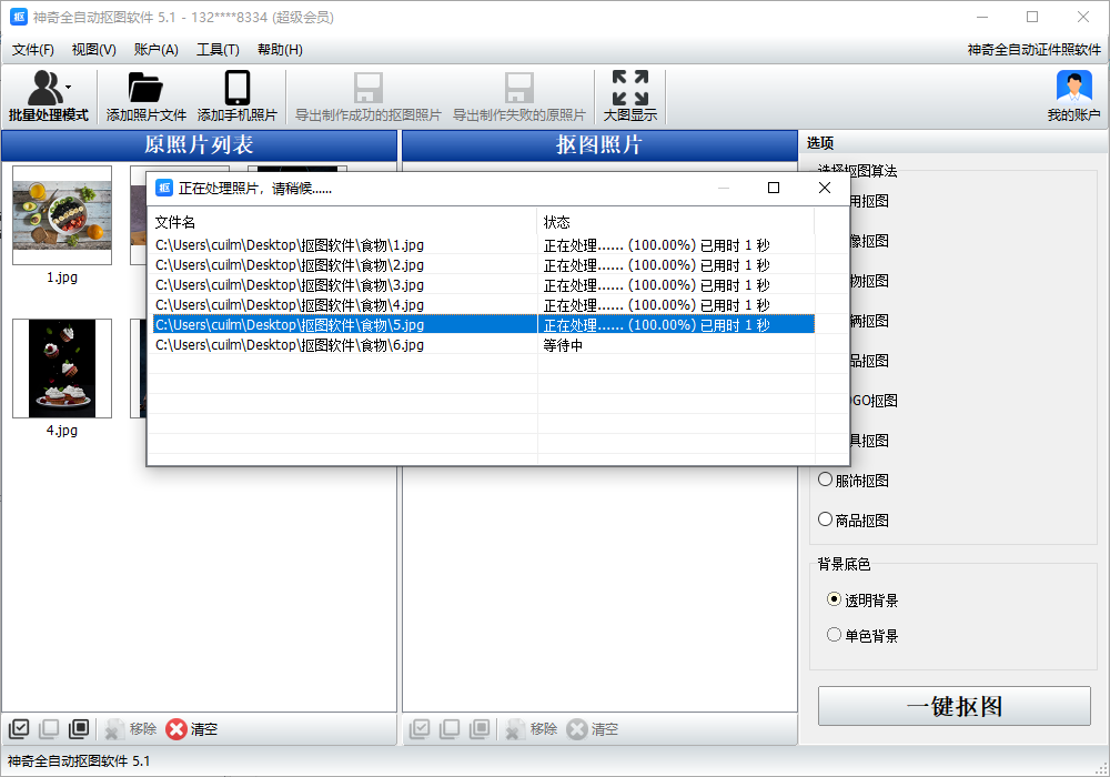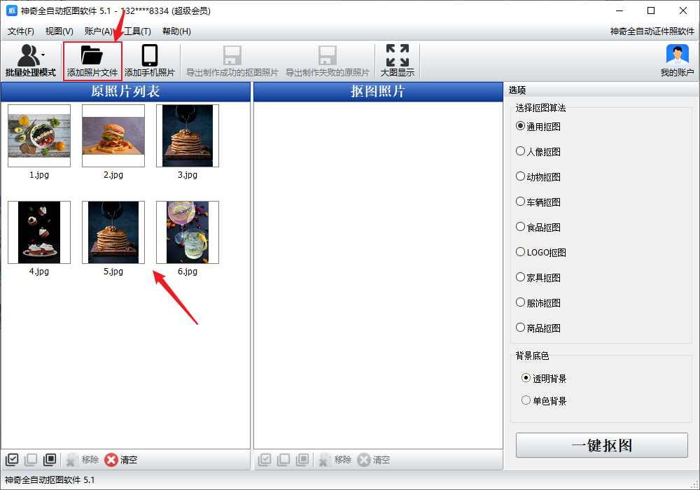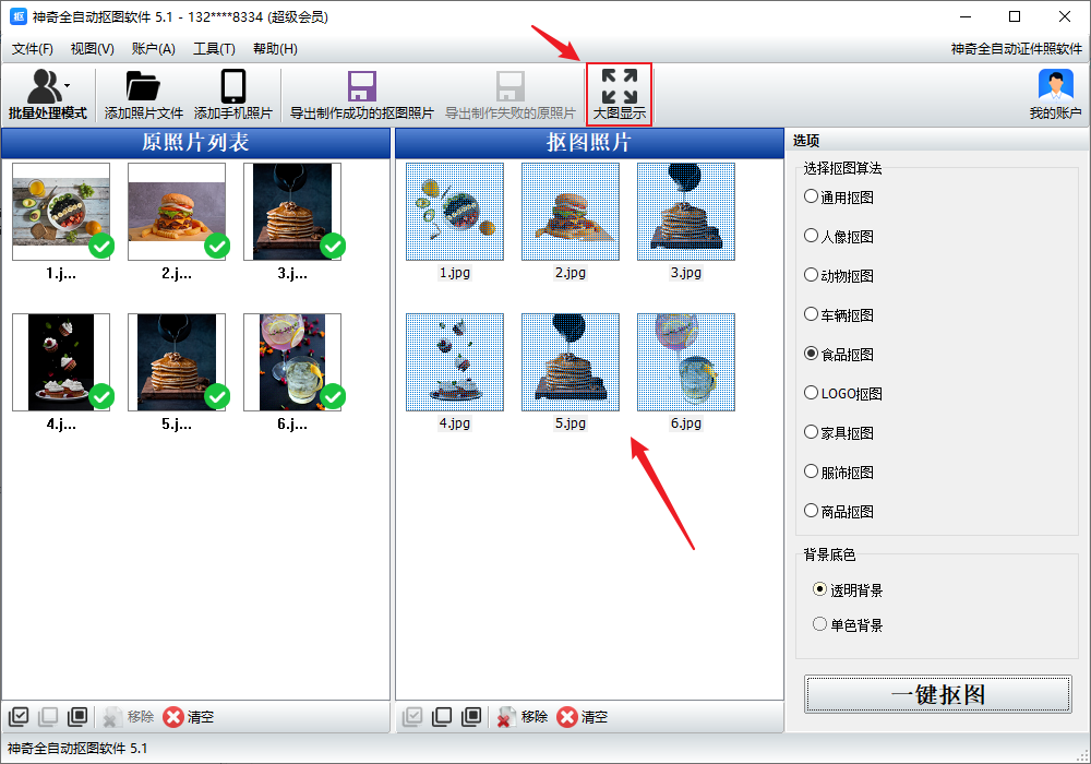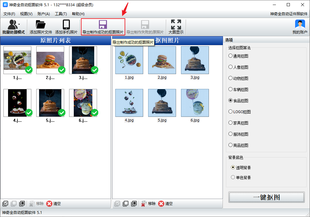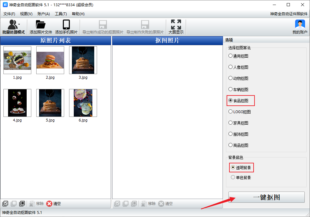 3、选项里选择食品抠图,背景底色选择透明背景,点击一键抠图。