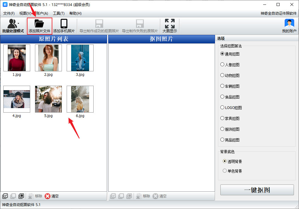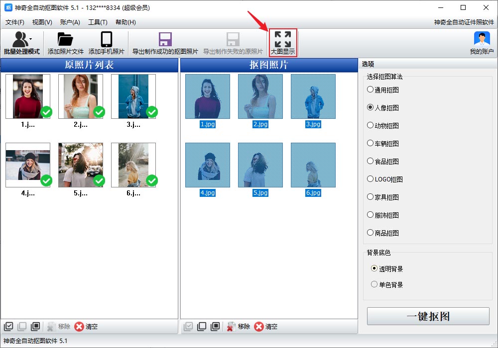 3、在抠图算法处选择人像抠图,背景底色选择透明背景,点击一键抠图。