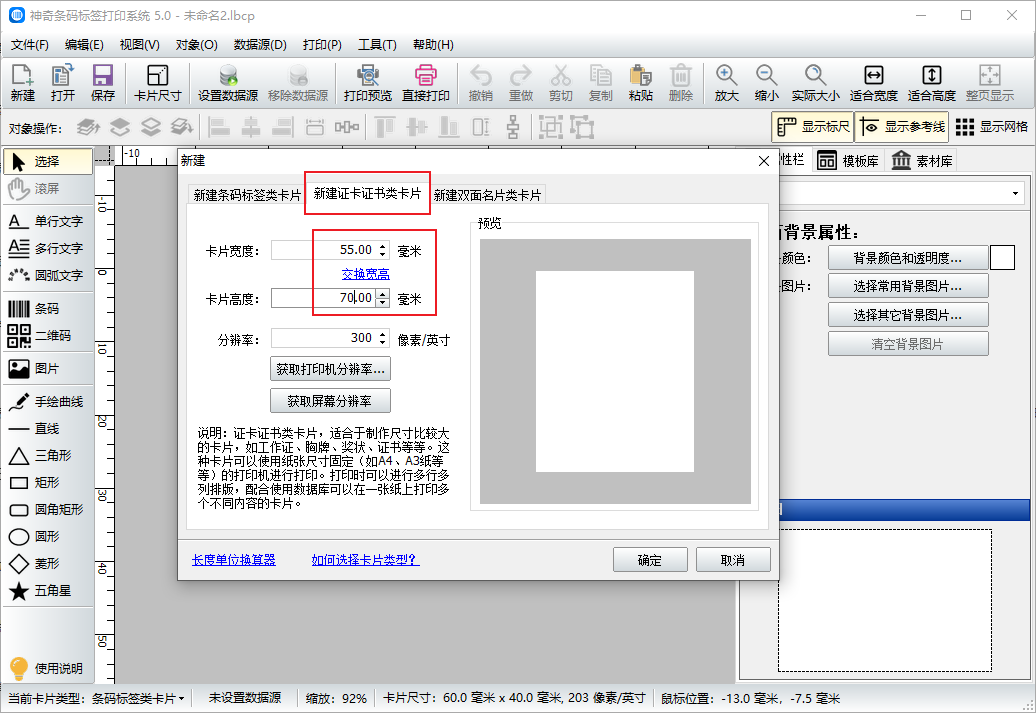 一、首先打开神奇条码标签软件,新建一个文件,因为我们做的是工作证,所以新建文件时需要选择证卡证书类文件。卡片的宽度和高度我们分别设置为55和70,您可以根据您的具体尺寸来设置。