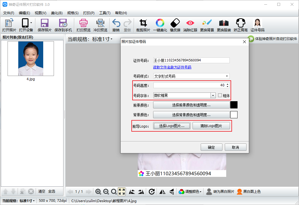 三、可以根据需要调整号码高度和号码字体,还可以点击选择logo图片按钮,添加logo图。也可以清除logo图片。
