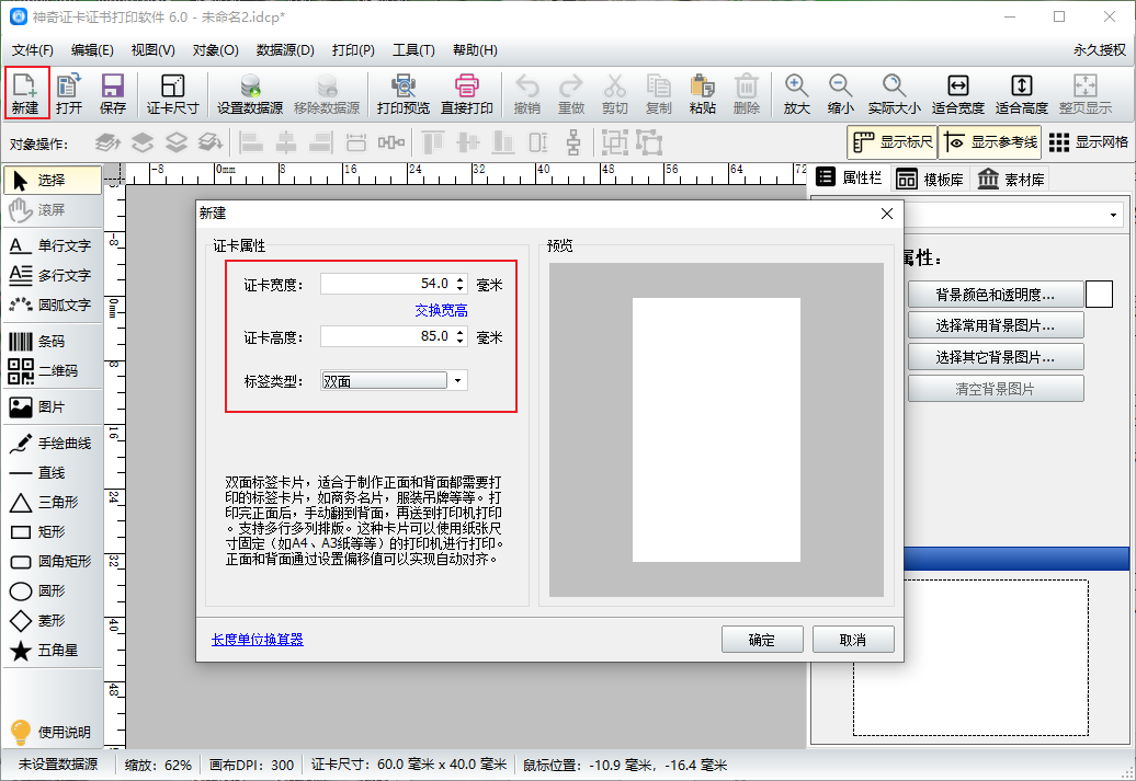 首先打开软件,新建一个文件,根据自己的需要设置卡片的尺寸,标签的类型我们选择双面。也可以根据自己的需要选择单面或者多面。