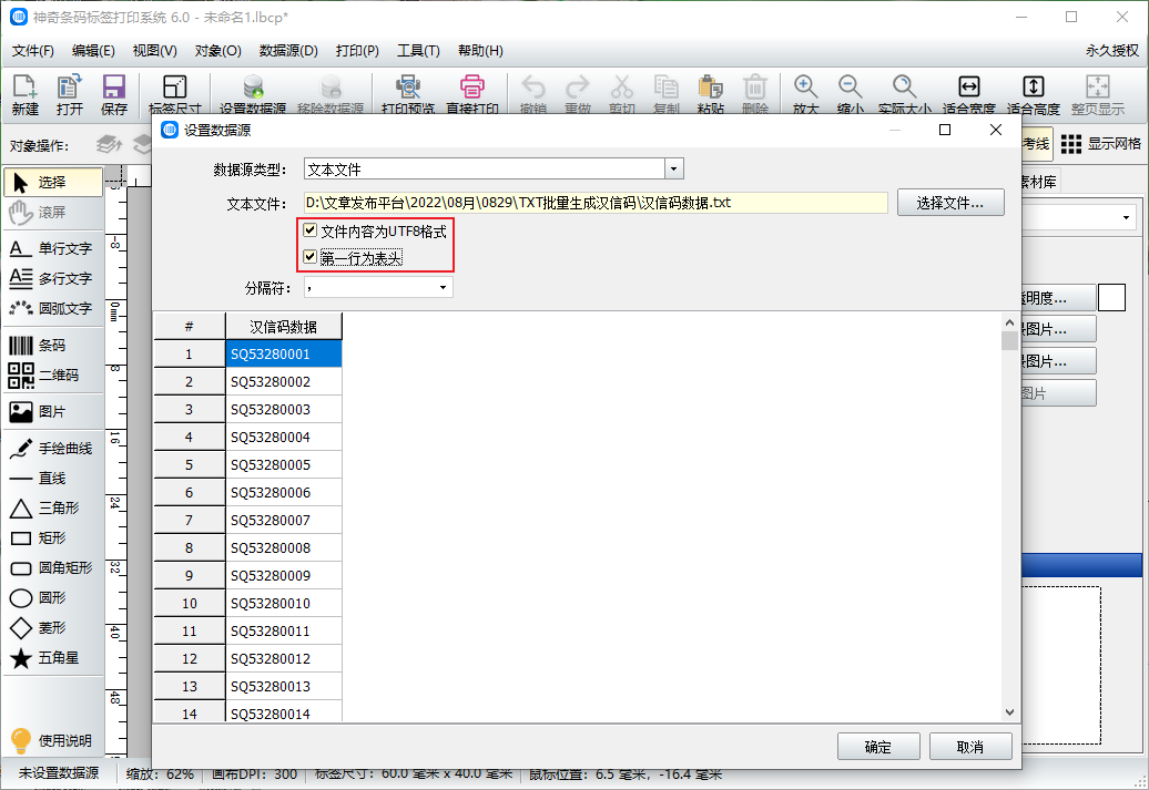 我们在使用条码标签软件批量制作条形码或者二维码时,很多时候是通过导入数据库的方式实现。软件目前支持的数据库文件类型有Excel、TXT、CSV、SQLite、Access、SQL Server、MySQL等。本文介绍的是把TXT数据批量生成汉信码的方法。