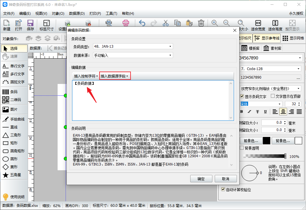 使用条码工具,在标签上绘制一个条形码,在弹出的界面中选择条形码的类型,因为我们的数据是JAN13条码,所以这里选择JAN13。