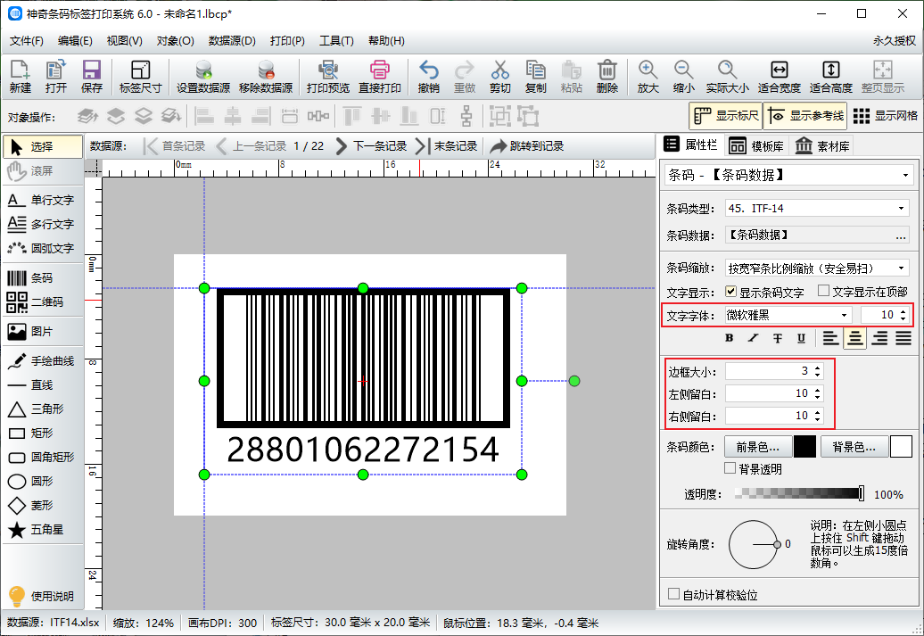 绘制条形码,点击软件左侧工具栏中的“条码”按钮,在标签上添加一个条形码,在弹出的编辑界面中将条码类型选择为ITF-14条码,点击插入数据源字段,选择条码数据。