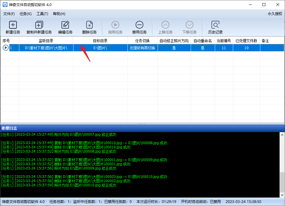 以上设置完成后,点击【确定】,就可以在主界面看到新建的任务了,点击【启用任务】,软件就开始工作了,下方的处理日志可以看到信息。