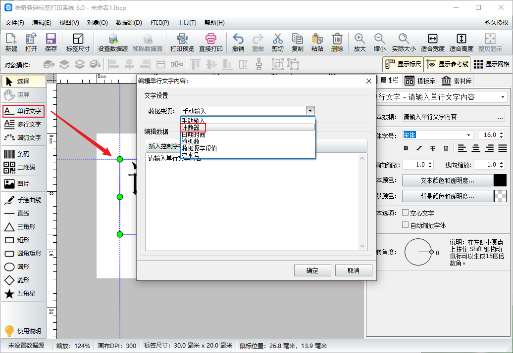 打开条码生成软件,新建一个标签并设置标签的尺寸,点击软件左侧的【单行文字】按钮,在标签上拖拽出一个文本框,在弹出的编辑界面里将数据来源设置为“计数器”。