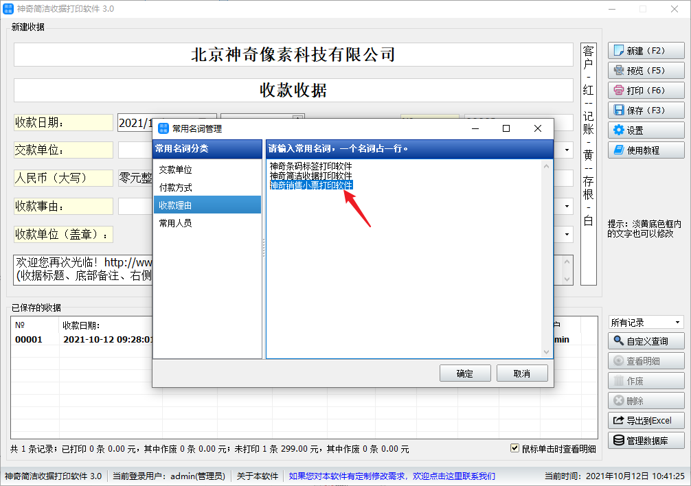 2、选择交款单位,输入常用的名词,注意一个名词占一行。
