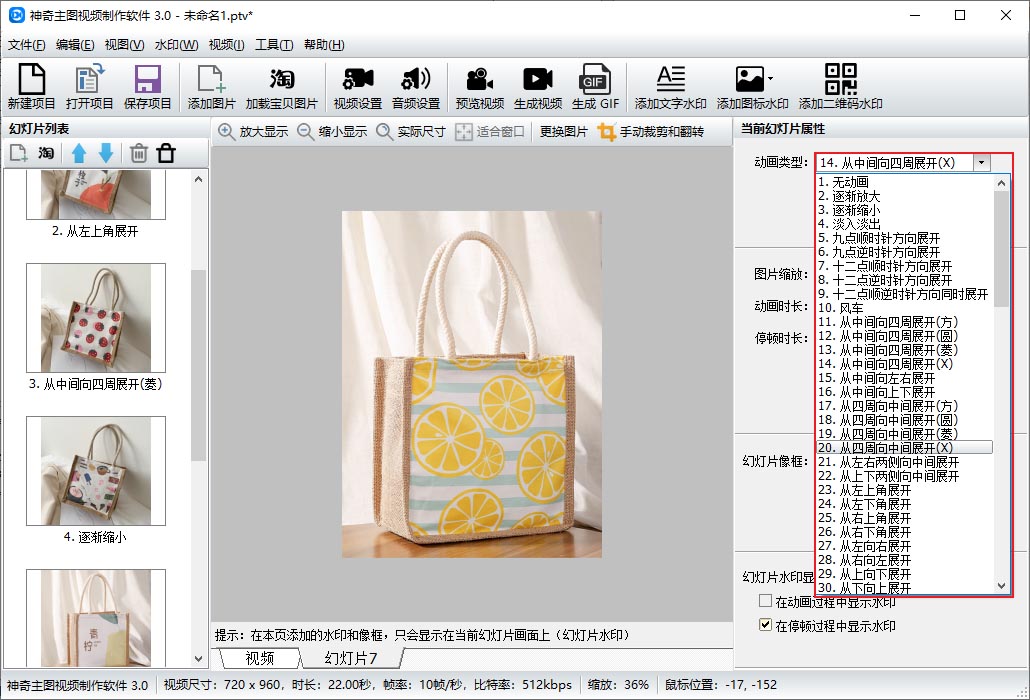 5、图片选择完成之后,点击确定按钮,选择的图片被导入软件,此时软件已经给每个图片添加了动画效果,如果需要修改,在右侧动画类型处选择新的动画效果。