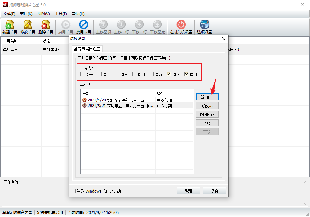 2、在一周内可以根据需要进行勾选,点击添加按钮,可以在日历中选择一年内的节假日。