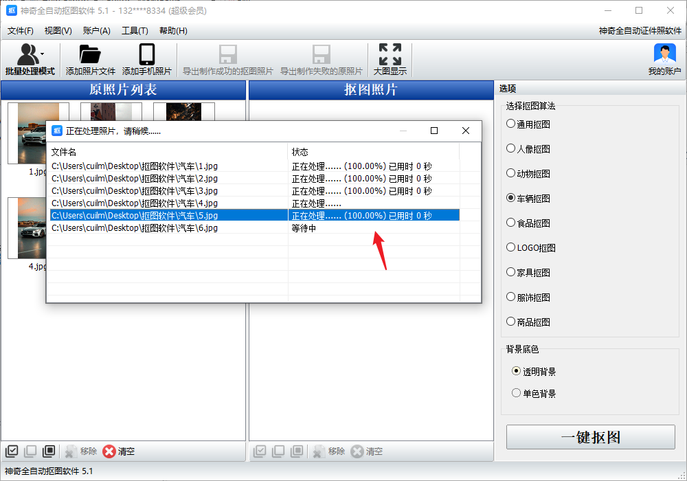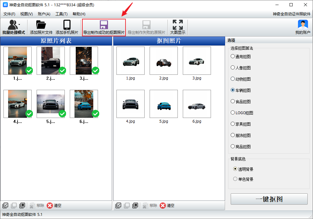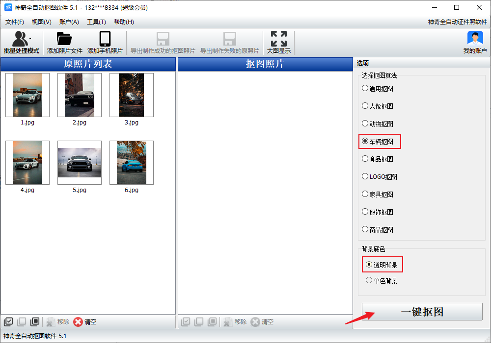 3、在选项处选择车辆抠图,背景底色选择透明背景,点击一键抠图。